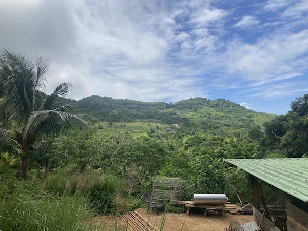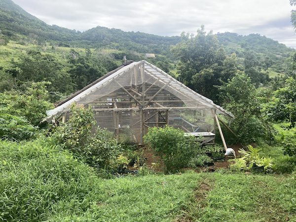 Laferm Coco est bien cachée au bout d’un chemin pierreux qui traverse les champs de canne à sucre. D’ailleurs, pour épargner notre voiture (et oui nous n’avons pas de pick-up!), Stéphane est très gentiment venu nous récupérer en bas du chemin qui mène à la ferme. En arrivant sur l’exploitation, on admire le paysage, les montagnes environnantes, les couleurs vives des fleurs et on apprécie l’atmosphère calme et apaisante des lieux. Le voyage au pays de Laferm Coco peut commencer.